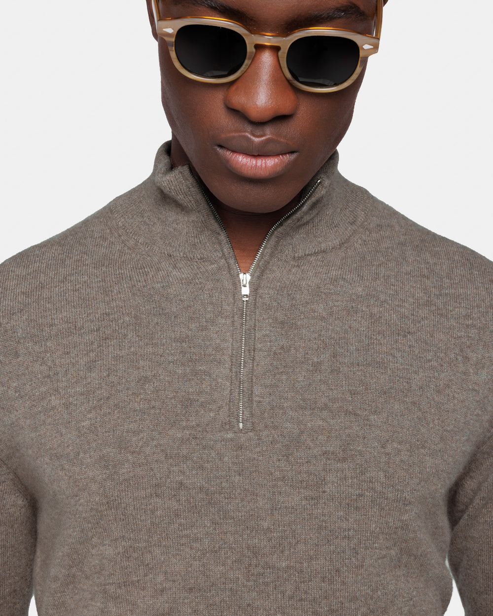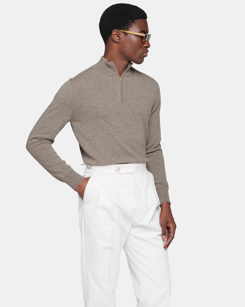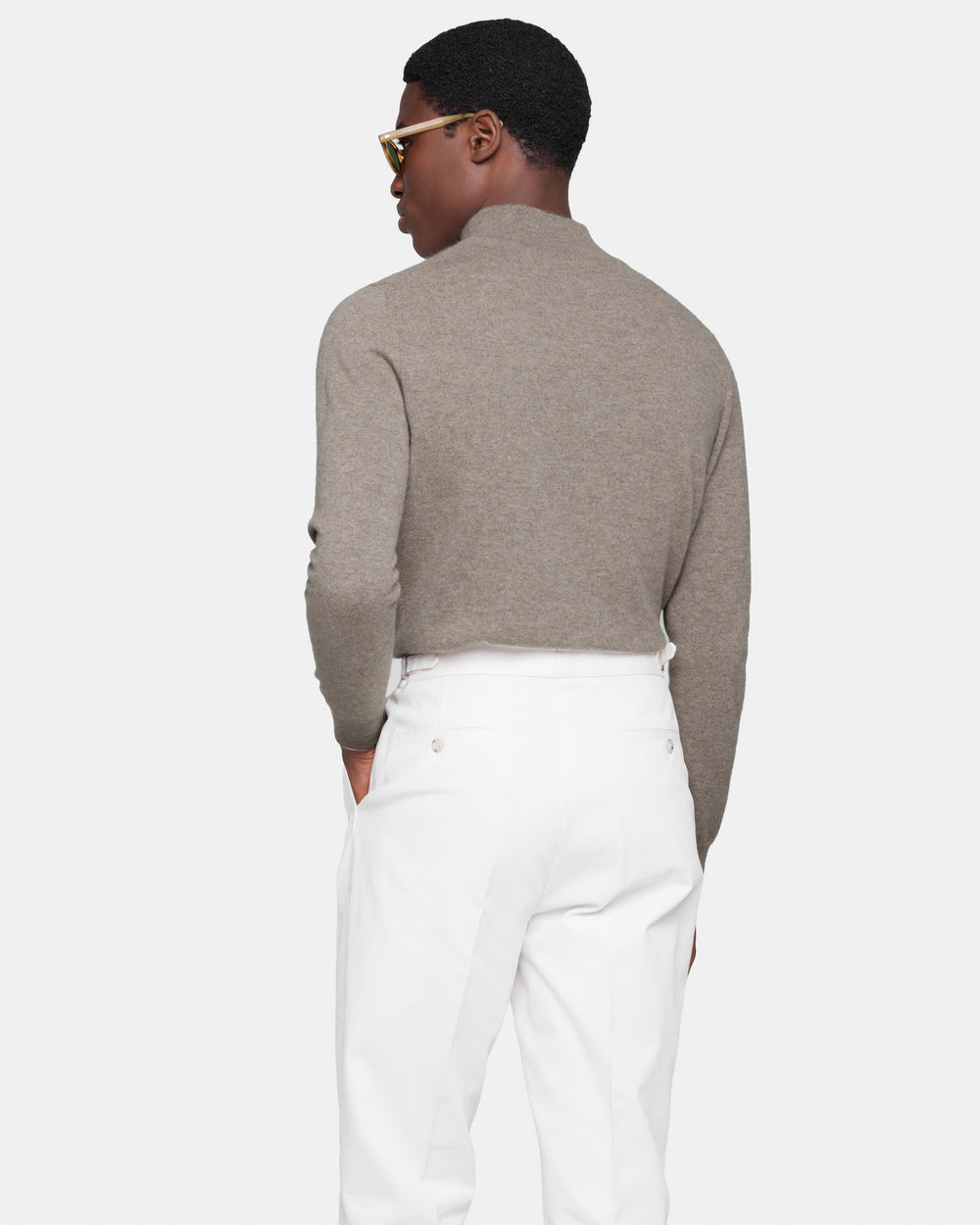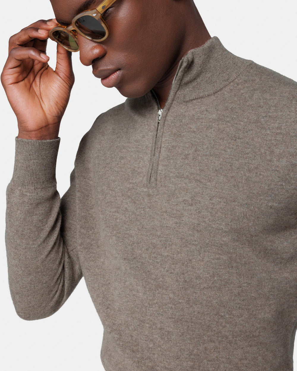 Maglia su misura ad 1 filo dal titolo 2/27 manica lunga tinta unita tortora scollo modello lupetto con zip Riri da 20 cm, realizzata in una pregiata, ricercata e finissima fibra di puro cashmere Crown Reserve proveniente dalle regioni più remote della Mongolia, per arrivare negli stabilimenti di Quarona Sesia in Piemonte, dove viene abilmente lavorata dalla filatura più prestigiosa al mondo per dare vita ad un filato cardato dal titolo 2/27.