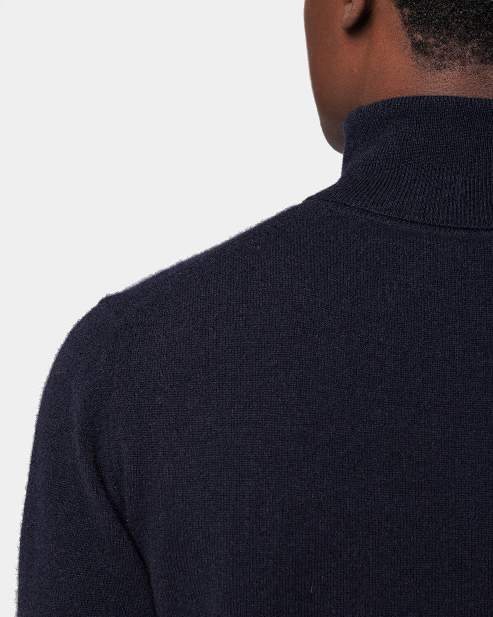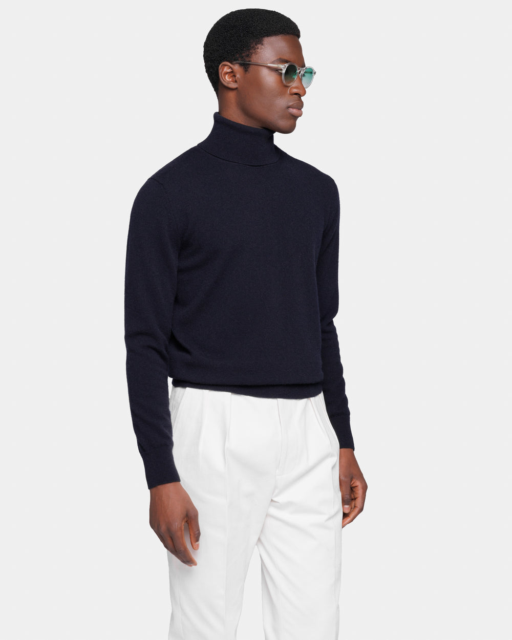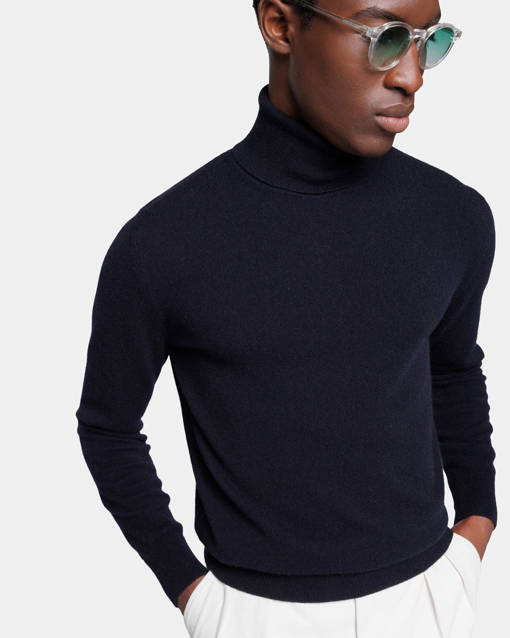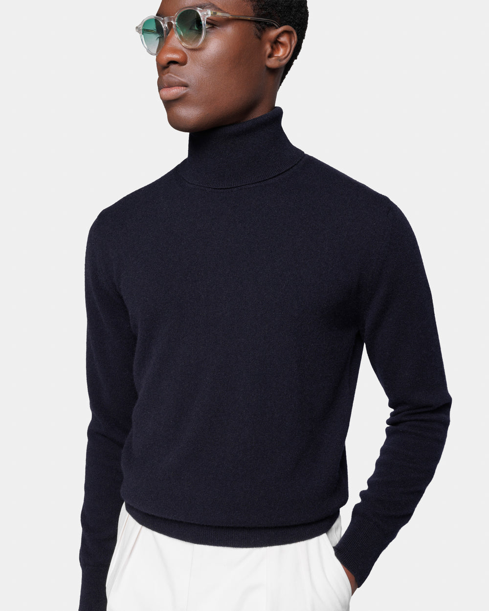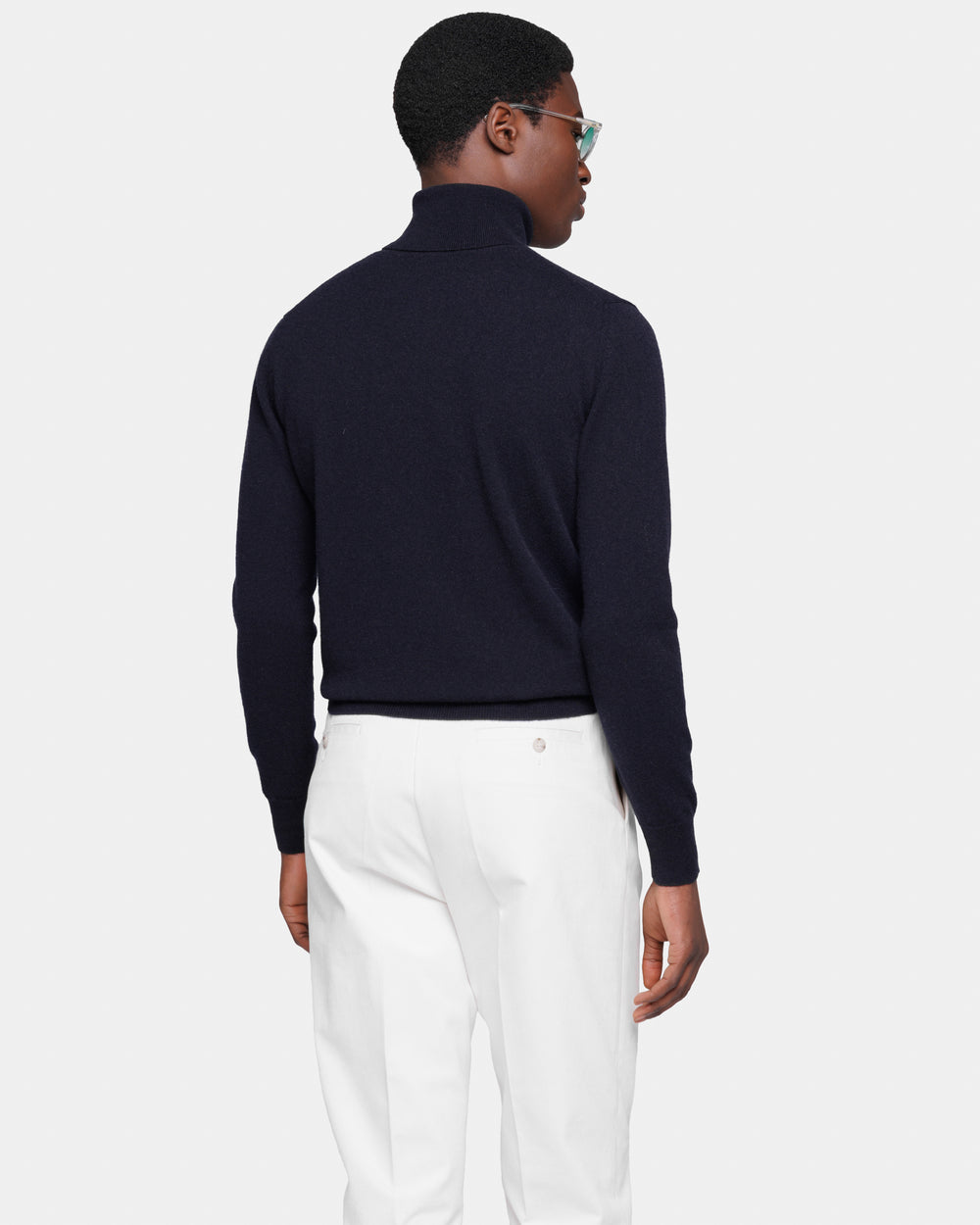 Maglia su misura ad 1 filo dal titolo 2/27 manica lunga tinta unita blu modello dolcevita, realizzata in una pregiata, ricercata e finissima fibra di puro cashmere Crown Reserve proveniente dalle regioni più remote della Mongolia, per arrivare negli stabilimenti di Quarona Sesia in Piemonte, dove viene abilmente lavorata dalla filatura più prestigiosa al mondo per dare vita ad un filato cardato dal titolo 2/27.