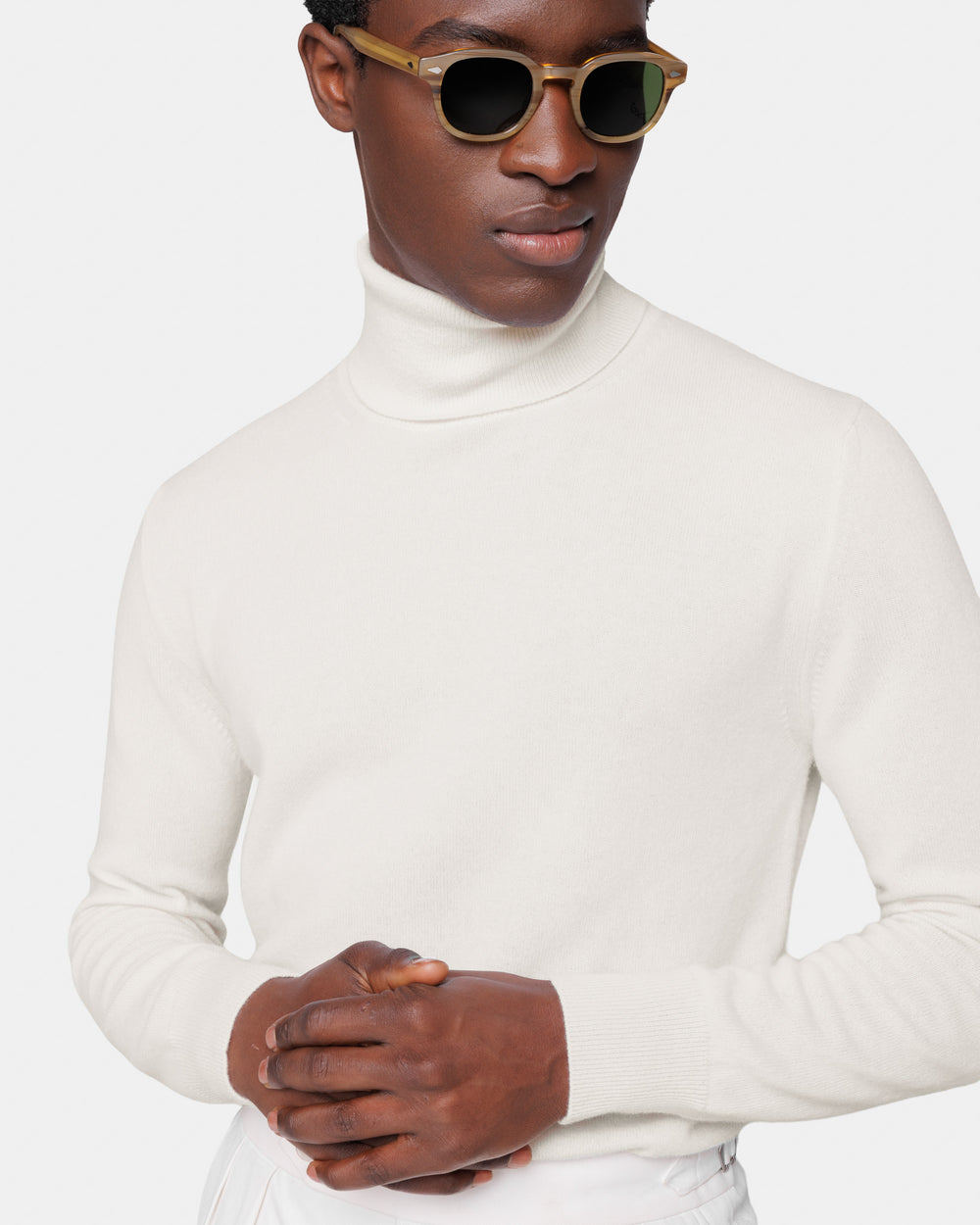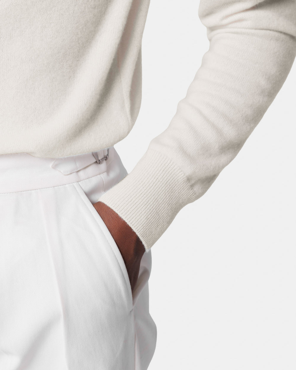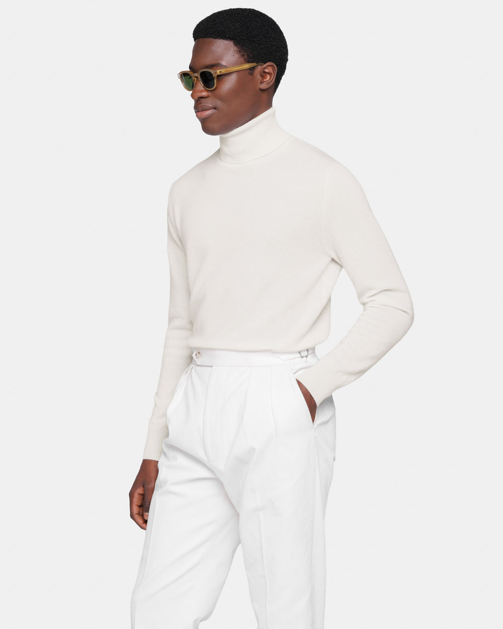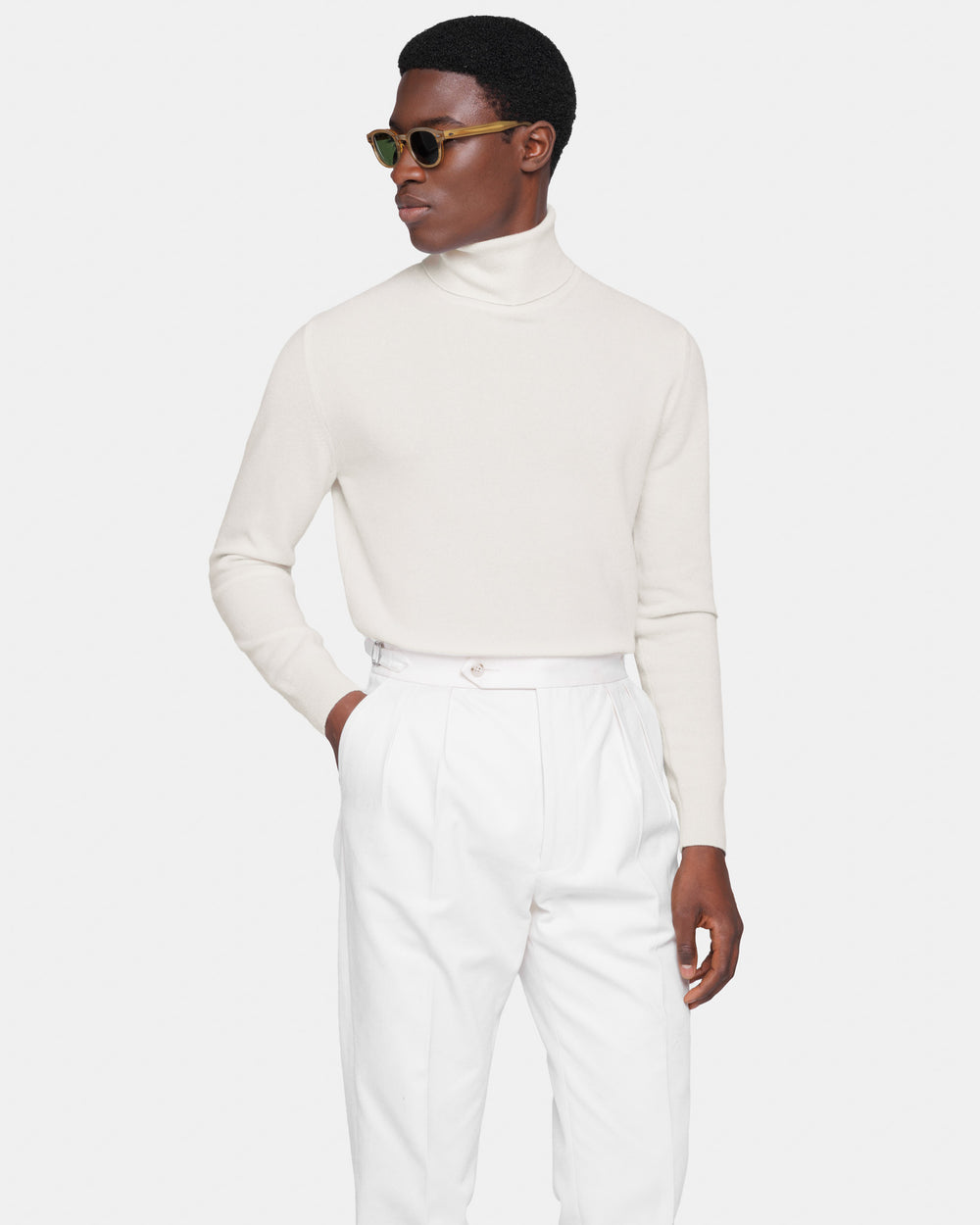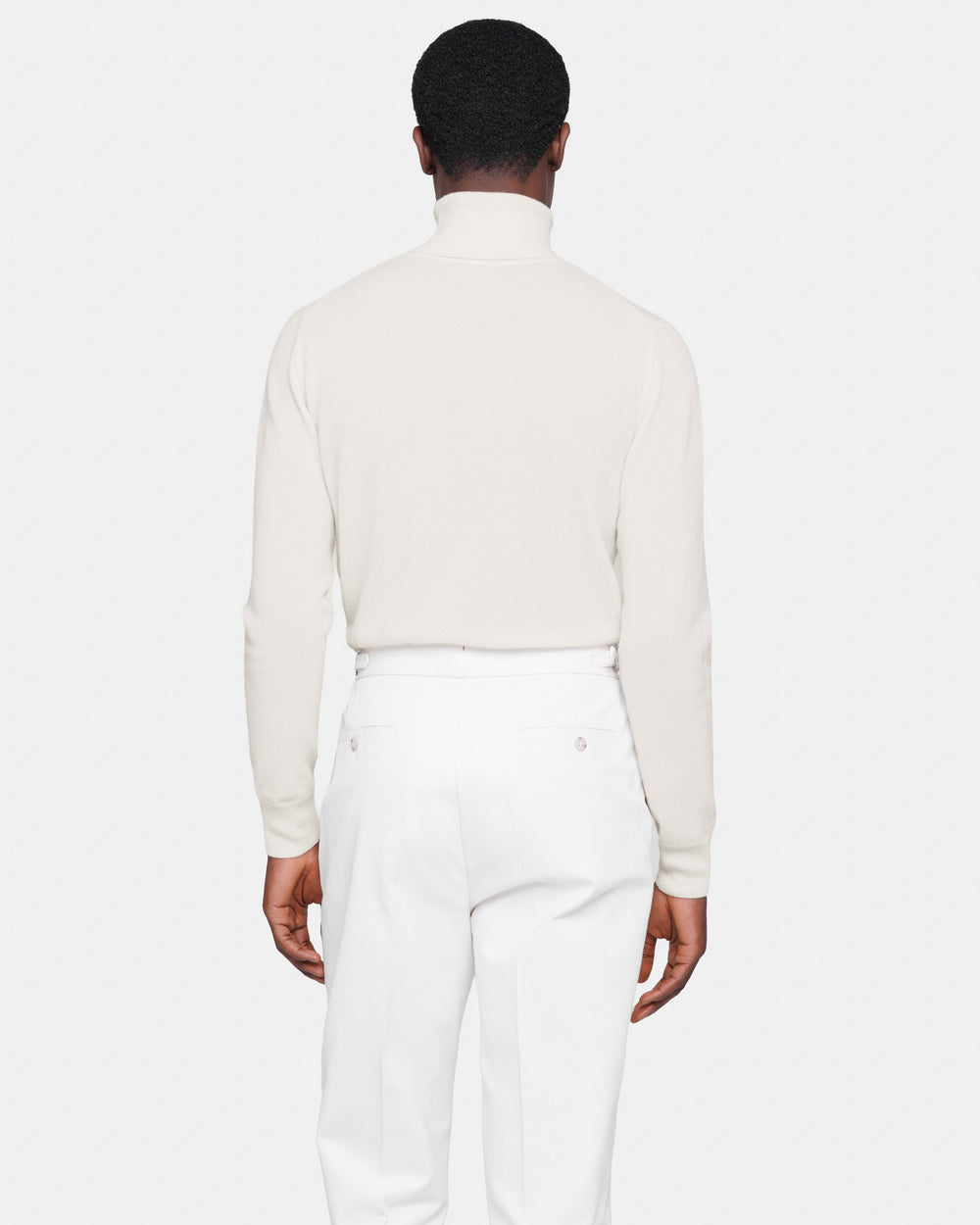 Maglia su misura ad 1 filo dal titolo 2/27 manica lunga tinta unita panna modello dolcevita, realizzata in una pregiata, ricercata e finissima fibra di puro cashmere Crown Reserve proveniente dalle regioni più remote della Mongolia, per arrivare negli stabilimenti di Quarona Sesia in Piemonte, dove viene abilmente lavorata dalla filatura più prestigiosa al mondo per dare vita ad un filato cardato dal titolo 2/27.