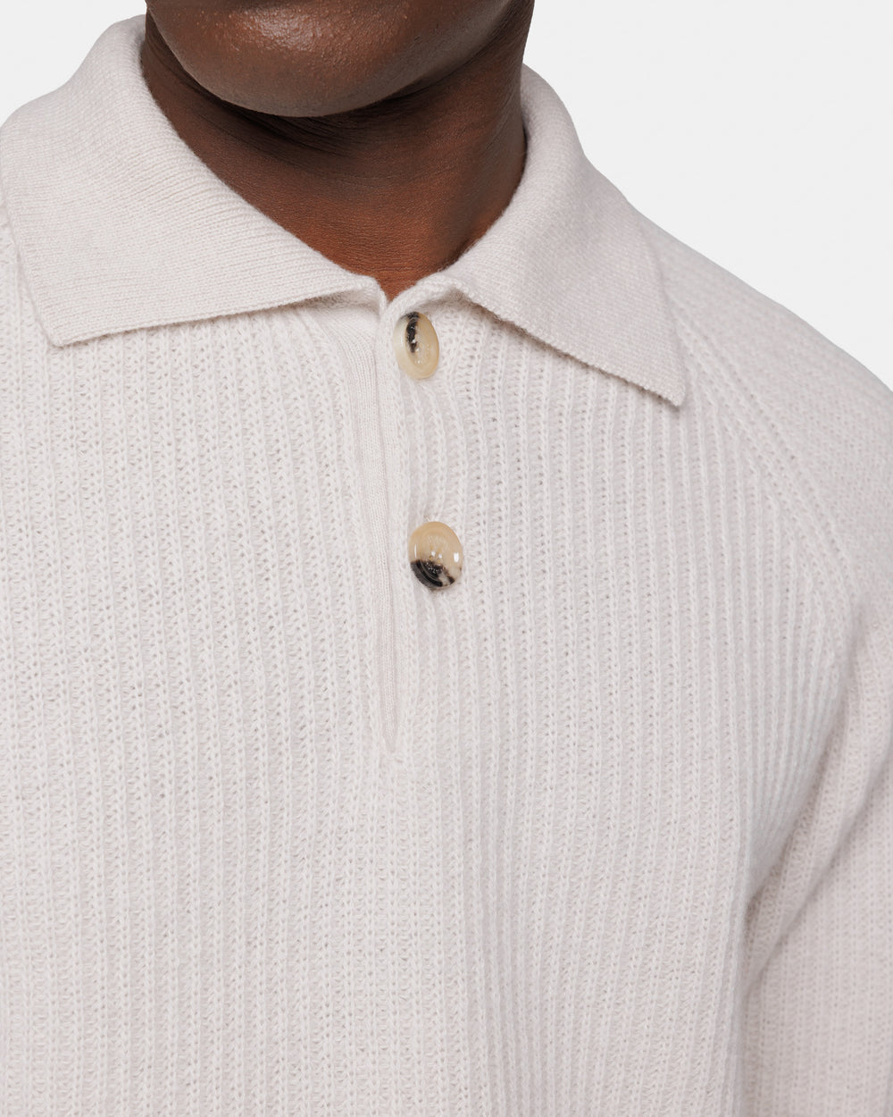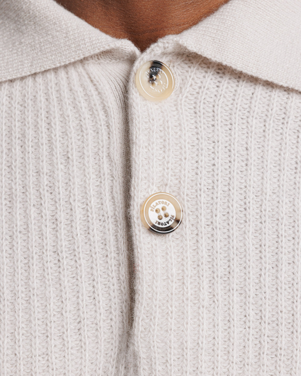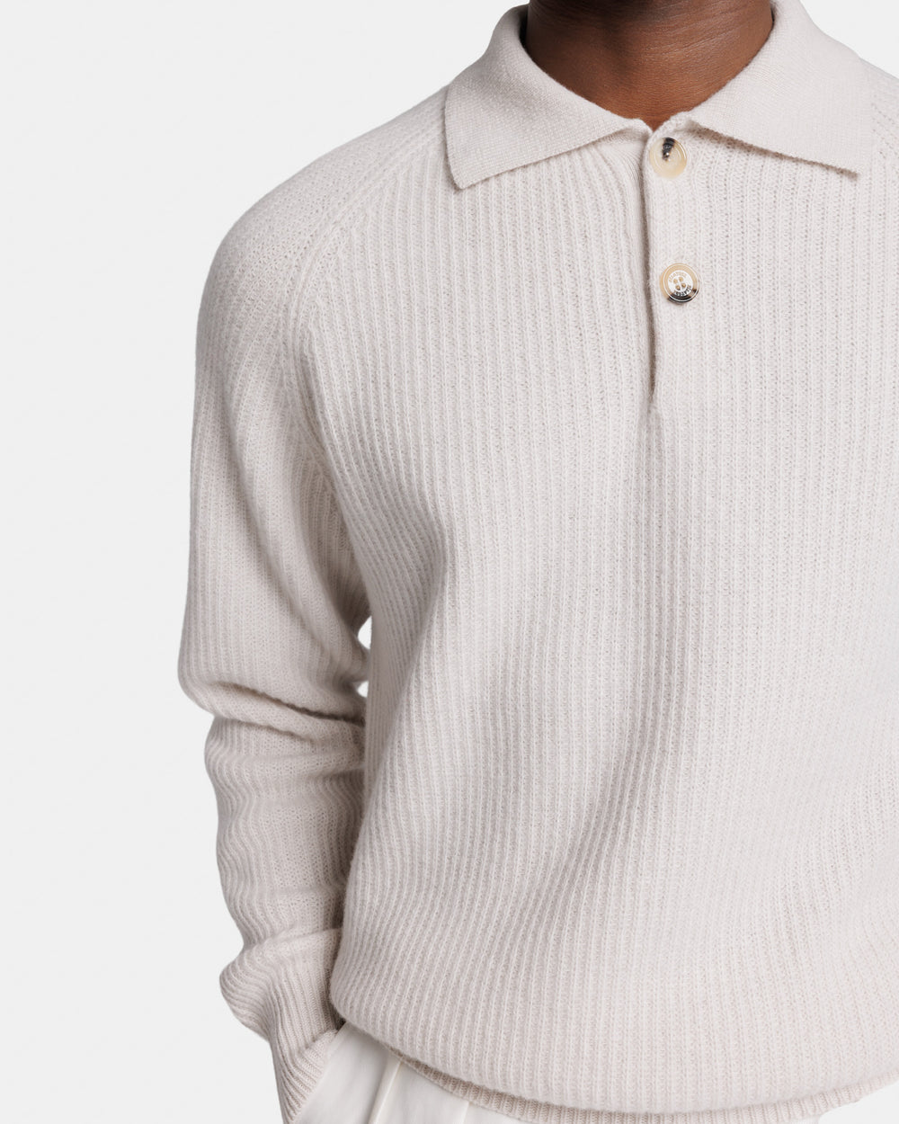 Maglia su misura a 2 fili super-fine titolo 1/15 NM, scollo polo con 2 bottoni in autentico Corno di mucca da 32 mm, manica lunga tinta unita Meringa, realizzata con lussuosa Lana Cardata Super 100's, una pregiata fibra in lana che si distingue per la sua morbidezza e calore. La Lana Cardata, sottoposta al tradizionale processo di cardatura, dona al filato una consistenza voluminosamente soffice e una capacità termica unica, grazie alla presenza di microscopiche bolle d'aria intrappolate tra le fibre.