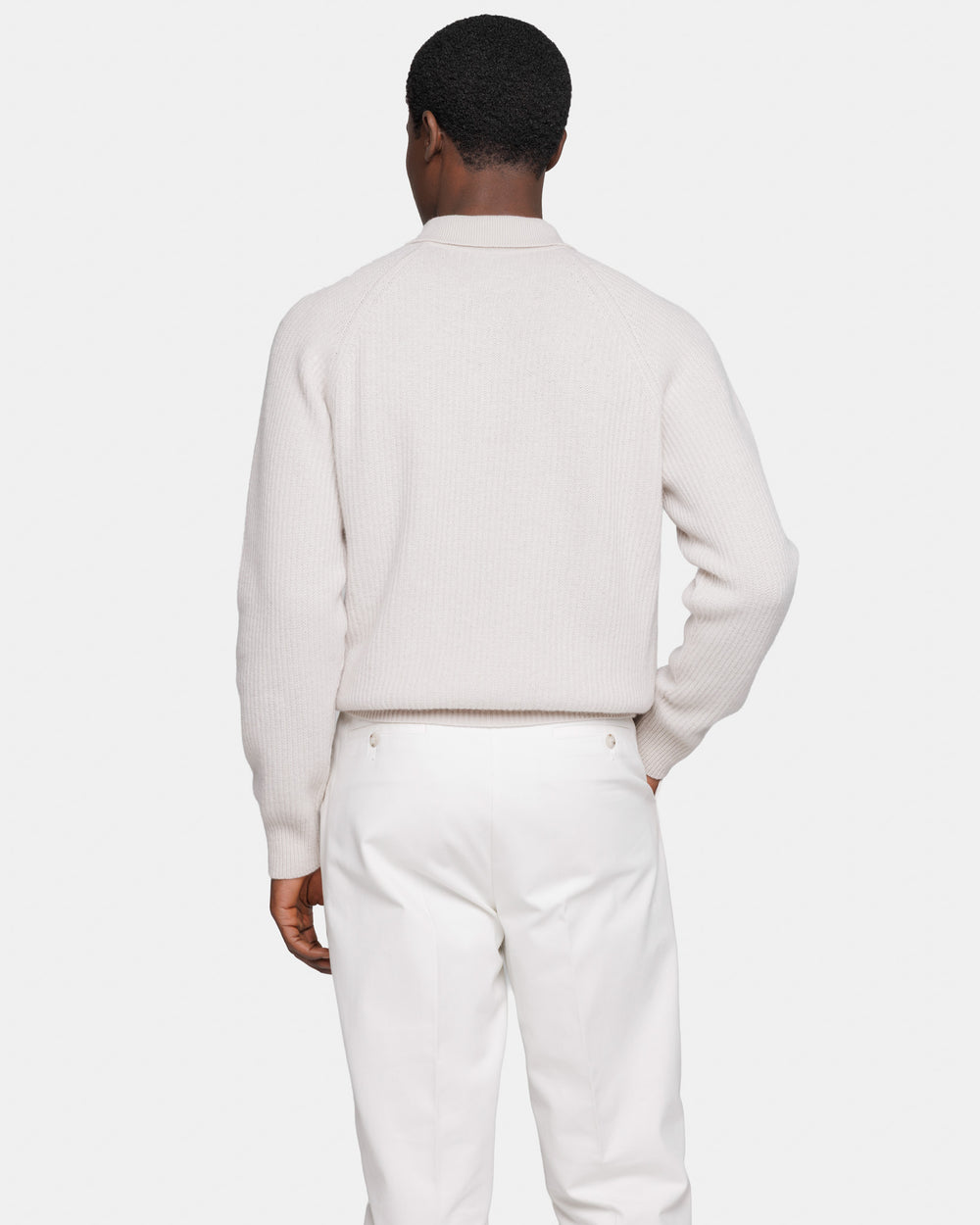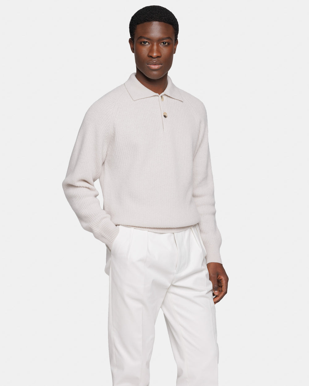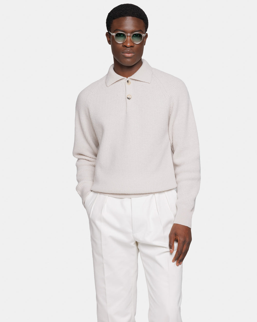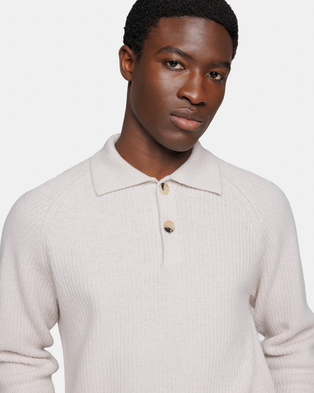 Maglia su misura a 2 fili super-fine titolo 1/15 NM, scollo polo con 2 bottoni in autentico Corno di mucca da 32 mm, manica lunga tinta unita Meringa, realizzata con lussuosa Lana Cardata Super 100's, una pregiata fibra in lana che si distingue per la sua morbidezza e calore. La Lana Cardata, sottoposta al tradizionale processo di cardatura, dona al filato una consistenza voluminosamente soffice e una capacità termica unica, grazie alla presenza di microscopiche bolle d'aria intrappolate tra le fibre.