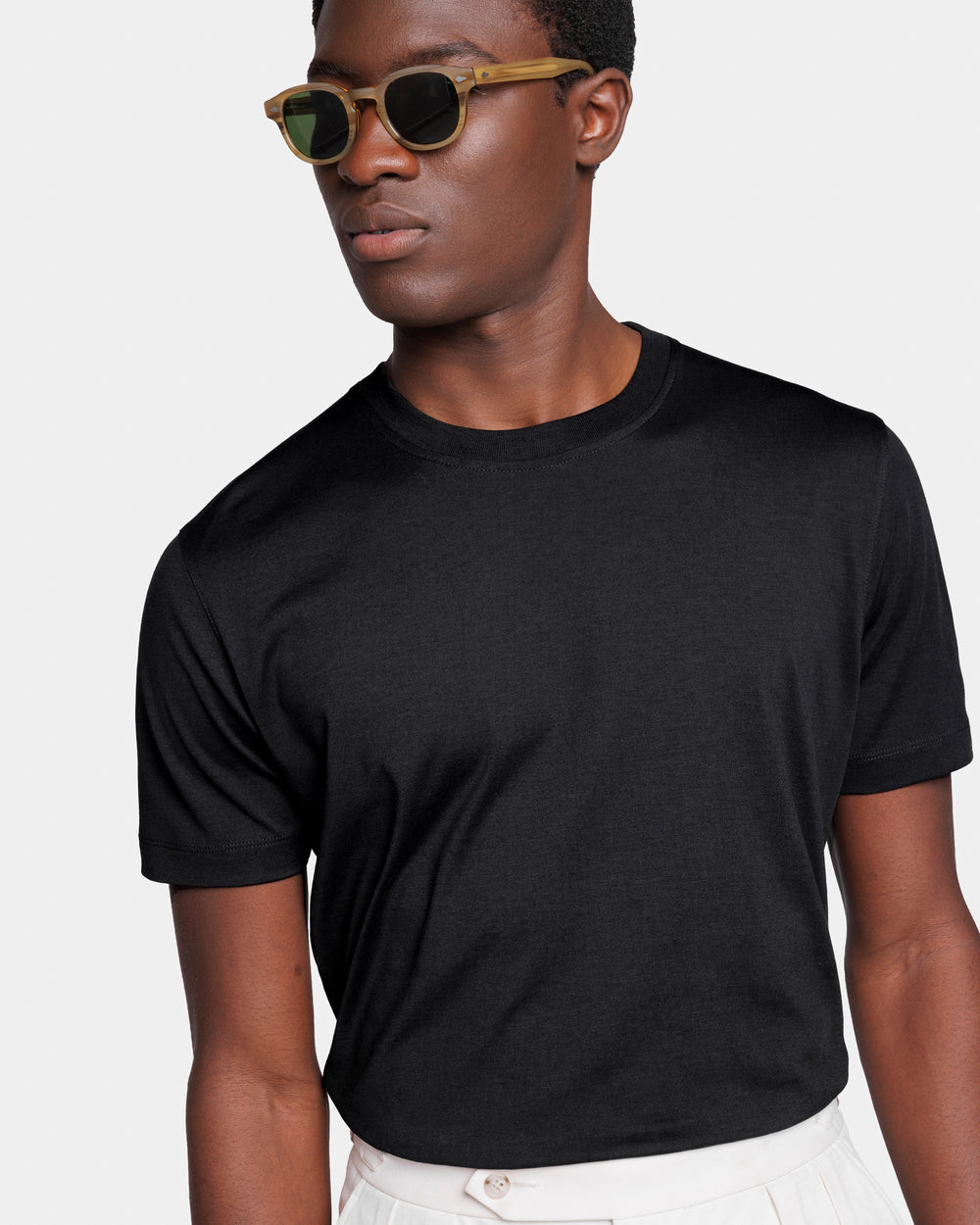 Realizzata nella lussuosa miscela di jersey 2/115.000 di 60% Seta Mulberry e 40% Cotone Organico, lavorato a maglia su telaio finezza 28, colore Nero della tessitura italiana Maglificio Maggia, presenta una mano straordinariamente morbida ed un aspetto semi opaco, combinando la freschezza del cotone con la leggerezza e la luminosità della seta, evocando le atmosfere estive delle isole remote e lo spirito decisamente rilassato delle nostre collezioni.