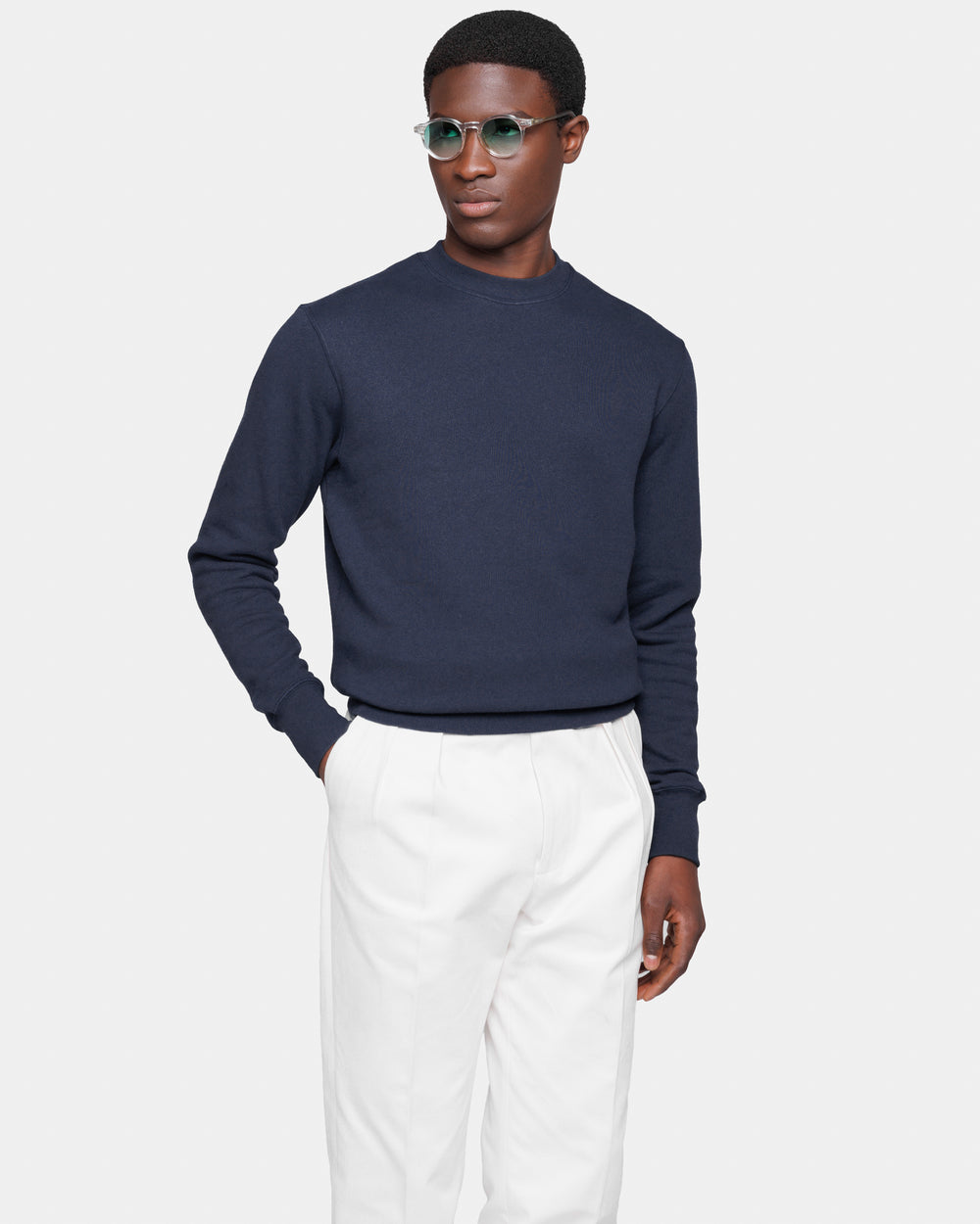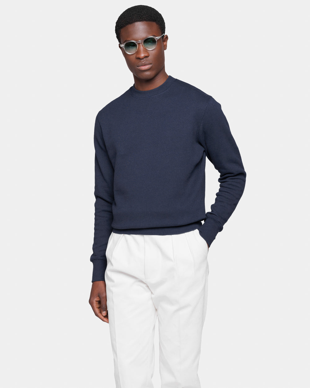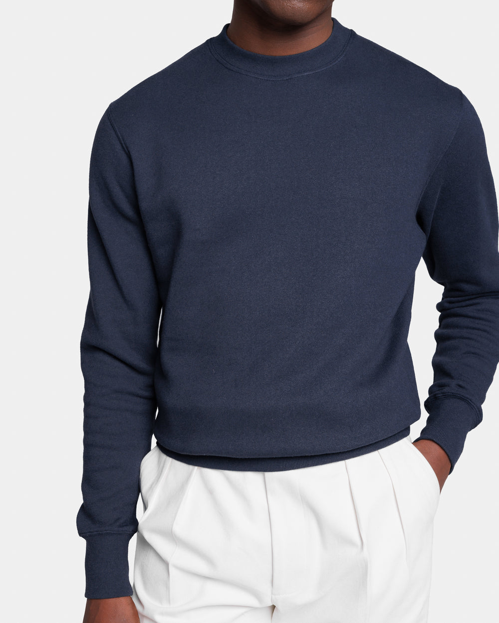 A crewneck sweatshirt is an excellent foundation for a relaxed style.