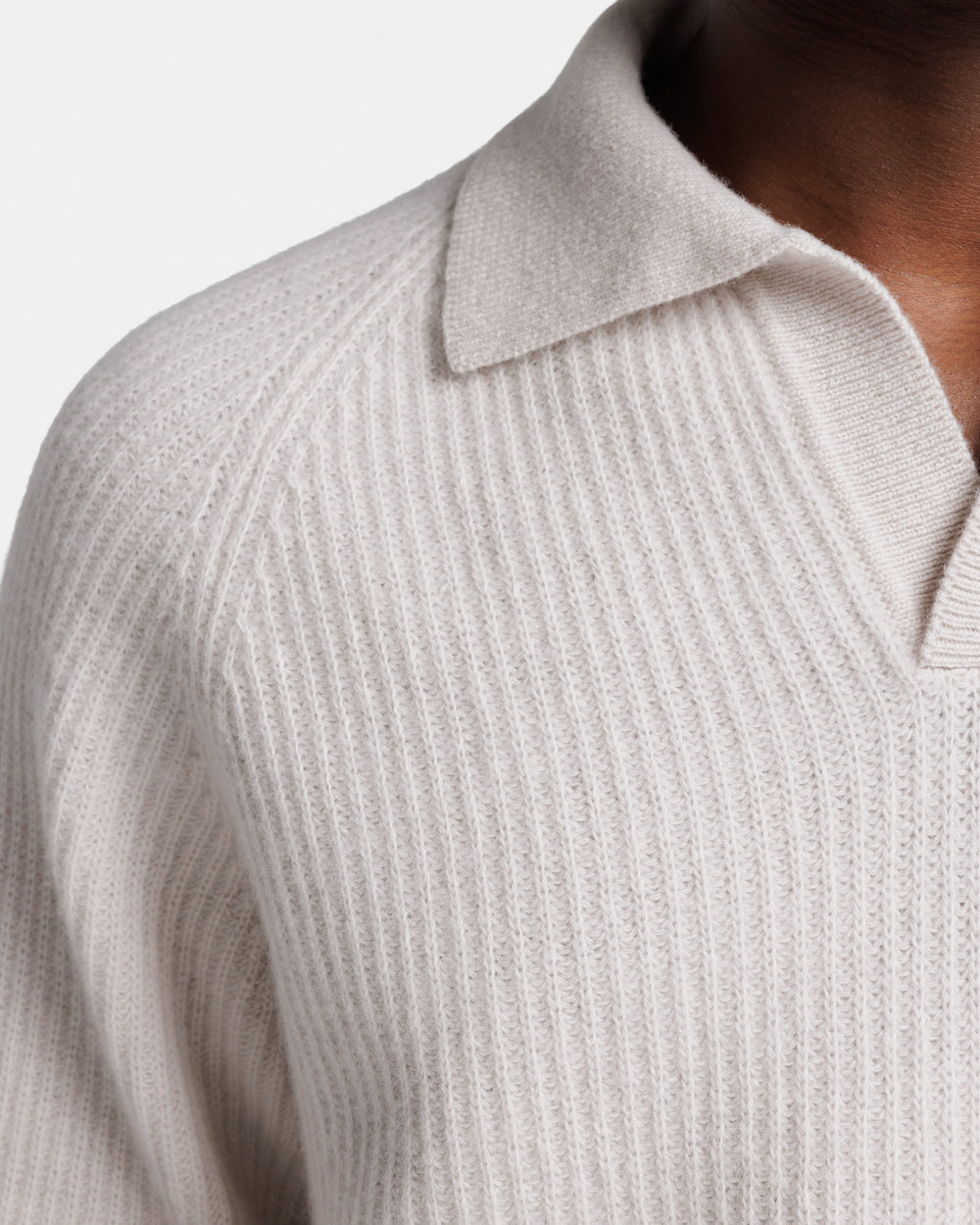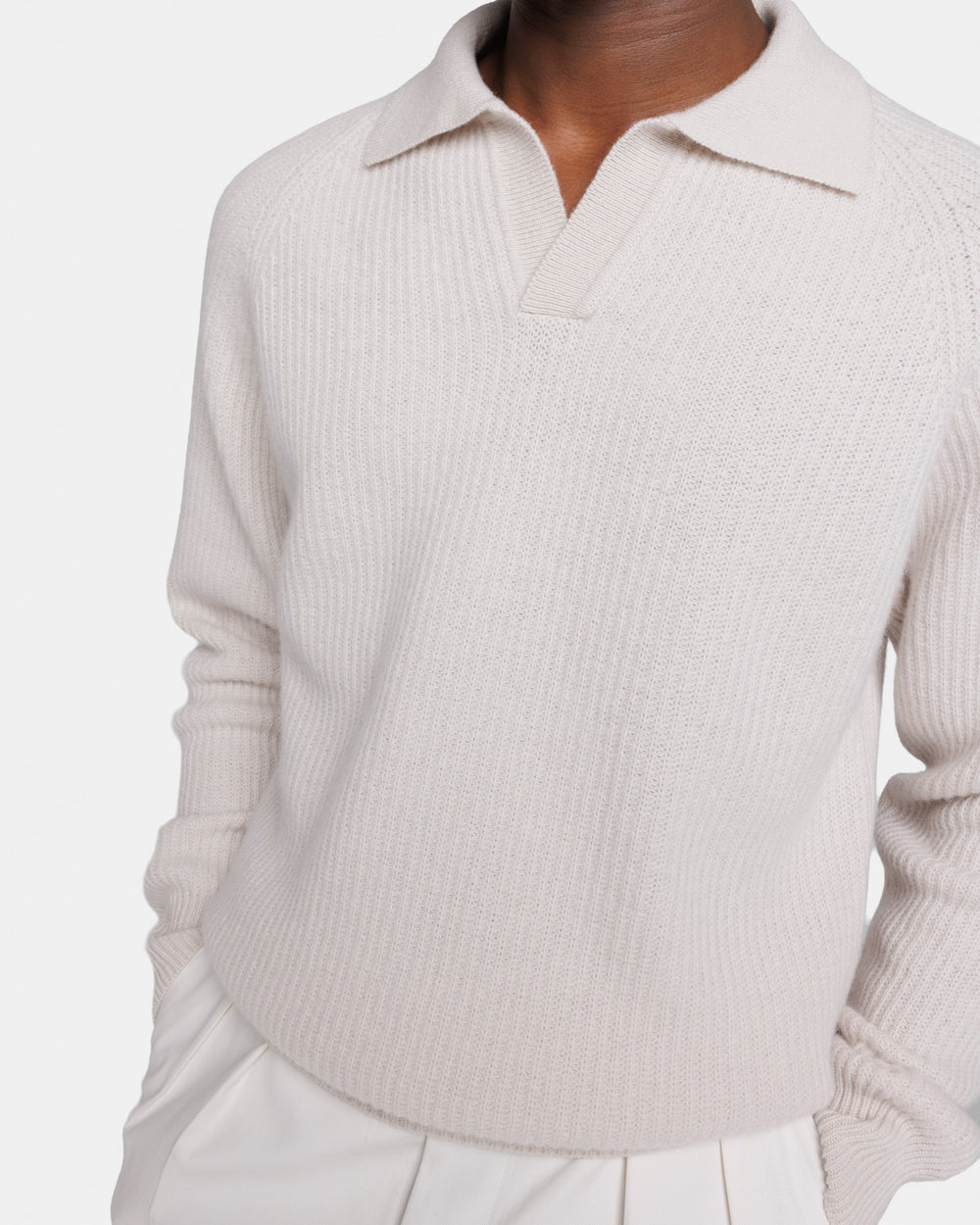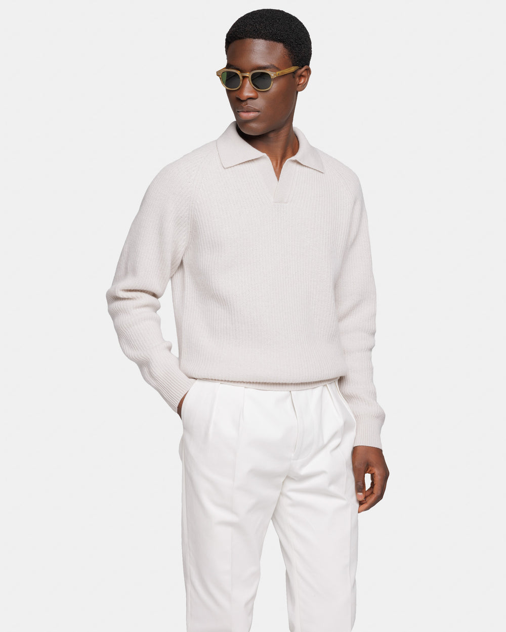 Buttonless Polo knitwear in 2-ply superfine yarn, 1/15 NM, long sleeves, solid meringue, made with luxurious Super 100's Carded Wool, a premium wool fiber known for its softness and warmth. The carded wool, subjected to the traditional carding process, gives the yarn a voluminous, soft texture and unique thermal properties, thanks to the microscopic air bubbles trapped between the fibers.