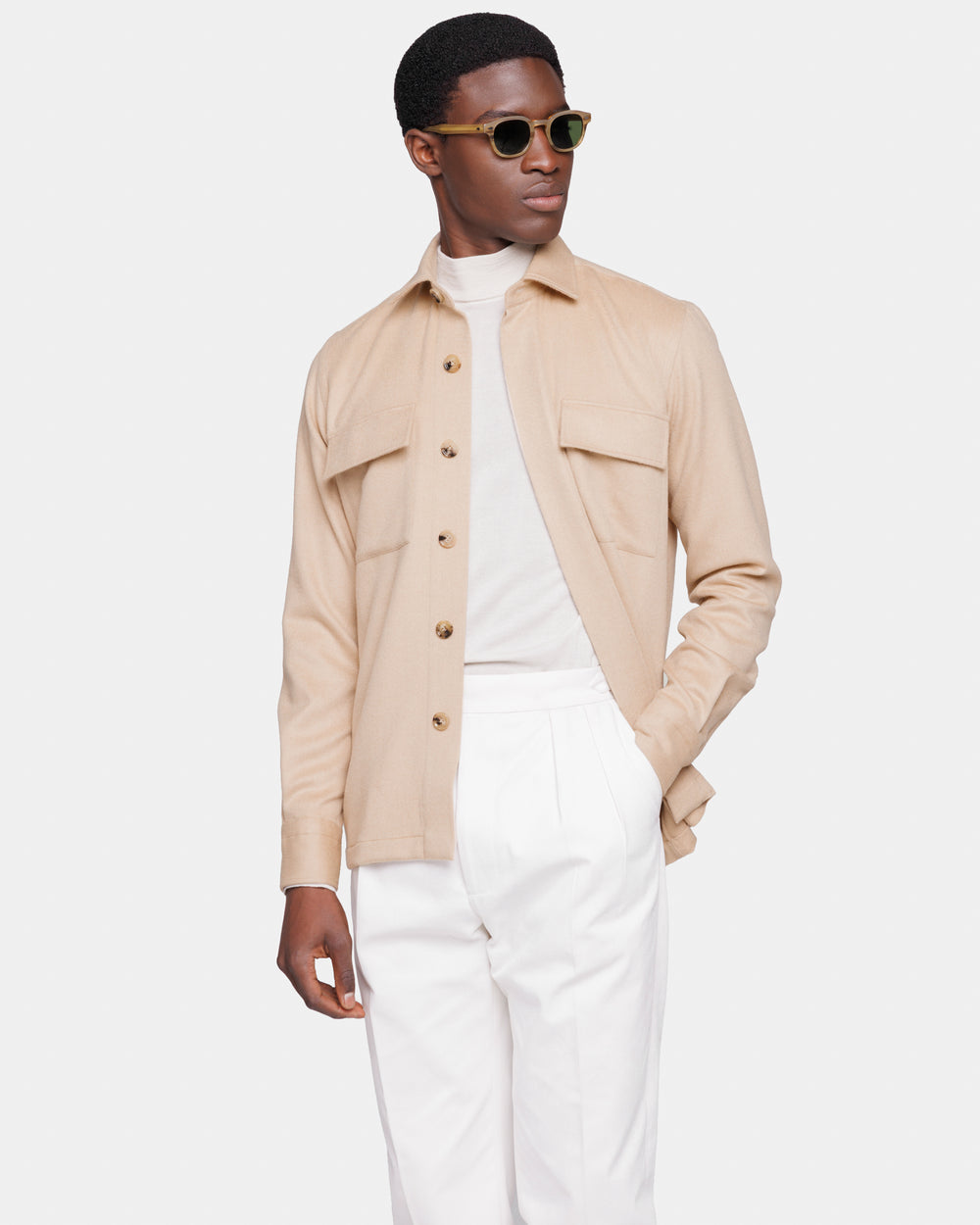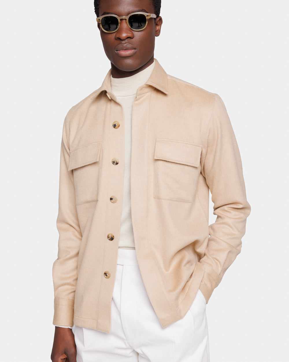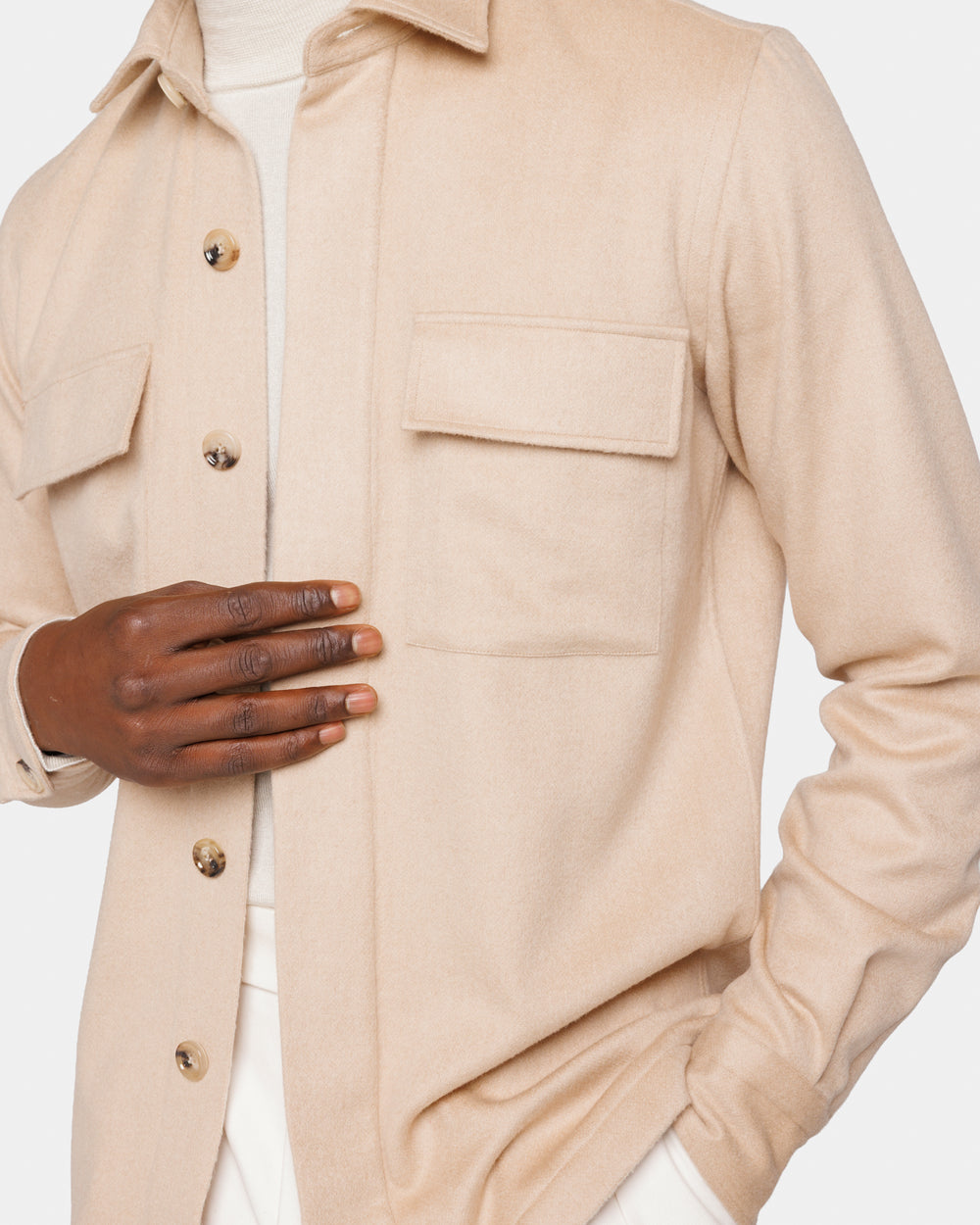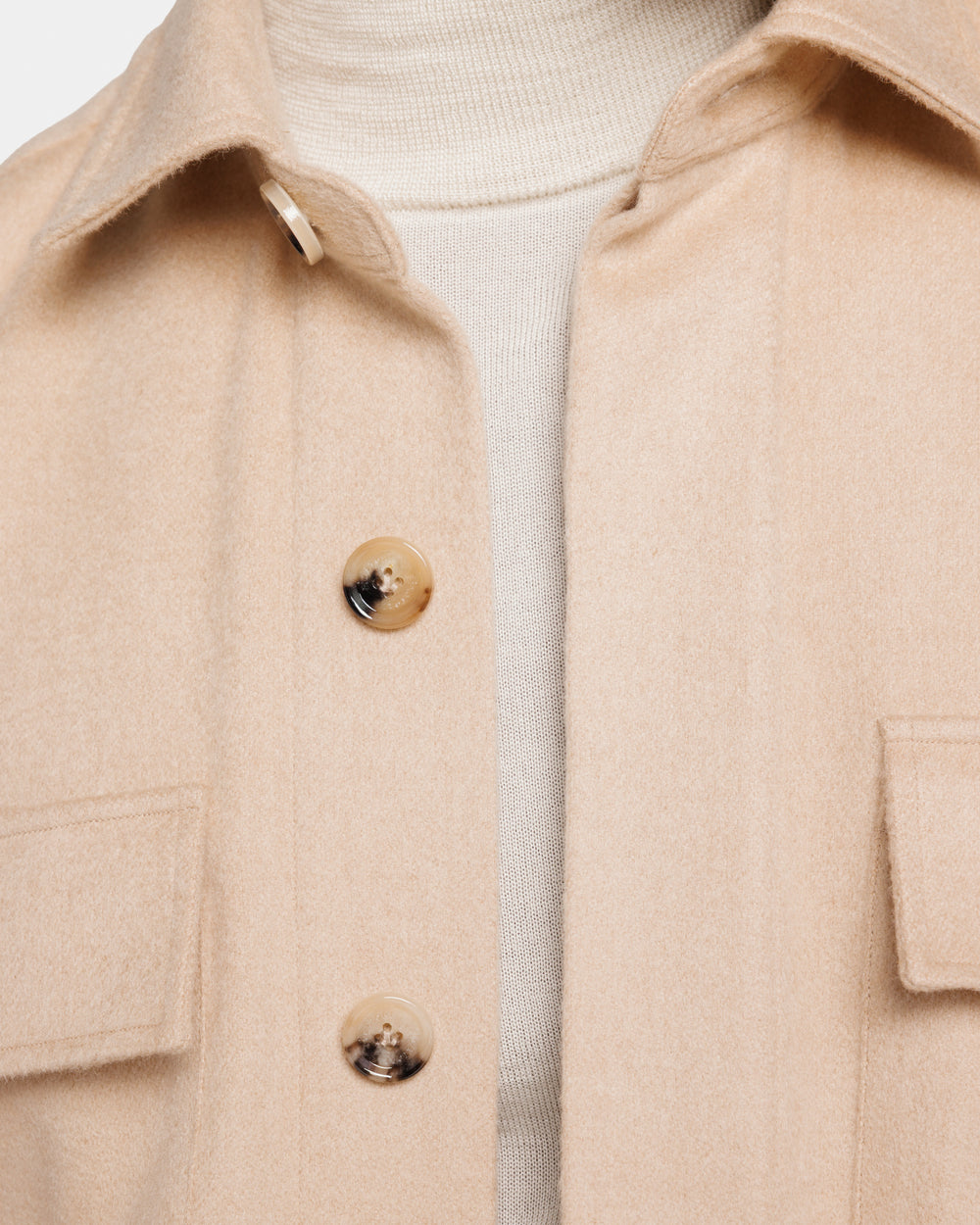 Tailor-made sand solid-color Overshirt with authentic 32 mm Buffalo Horn buttons, crafted from Loro Piana Bactrian 100% Baby Camel Hair fabric, made in Italy.